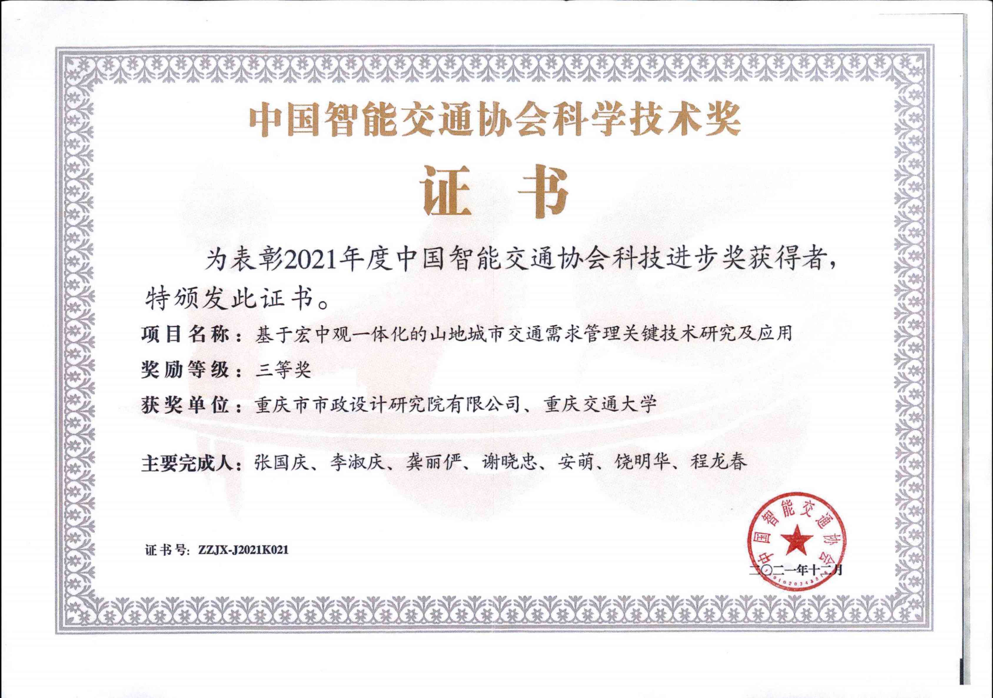 工程名称:基于宏中观一体化的山地城市交通需求管理关键技术研究及应用 奖项名称:2021年度中国智能交通协会科技进步奖