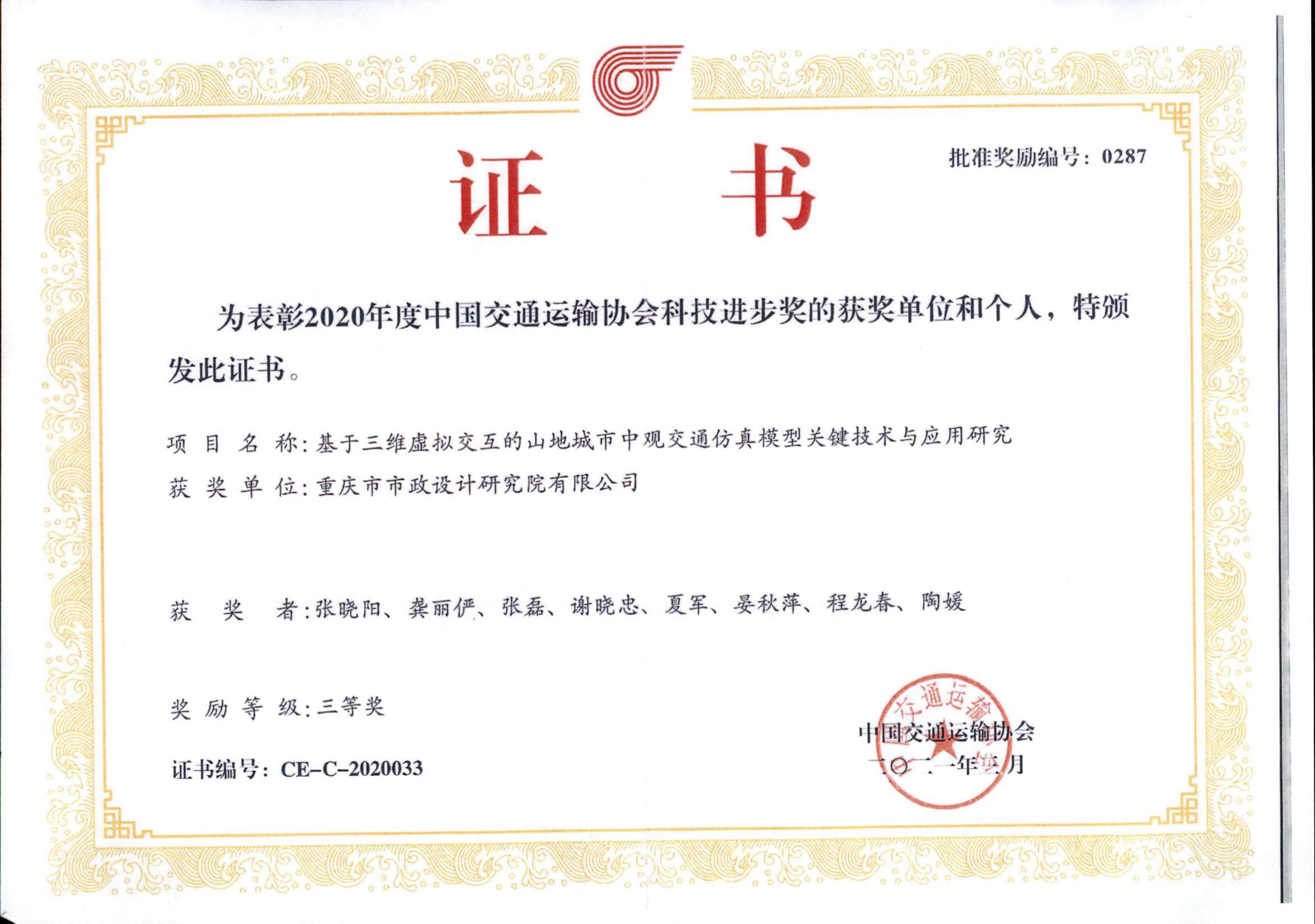 工程名称:基于三维虚拟交互的山地城市中观交通仿真模型关键技术与应用研究 奖项名称:2020年中国交通运输协会科技进步奖