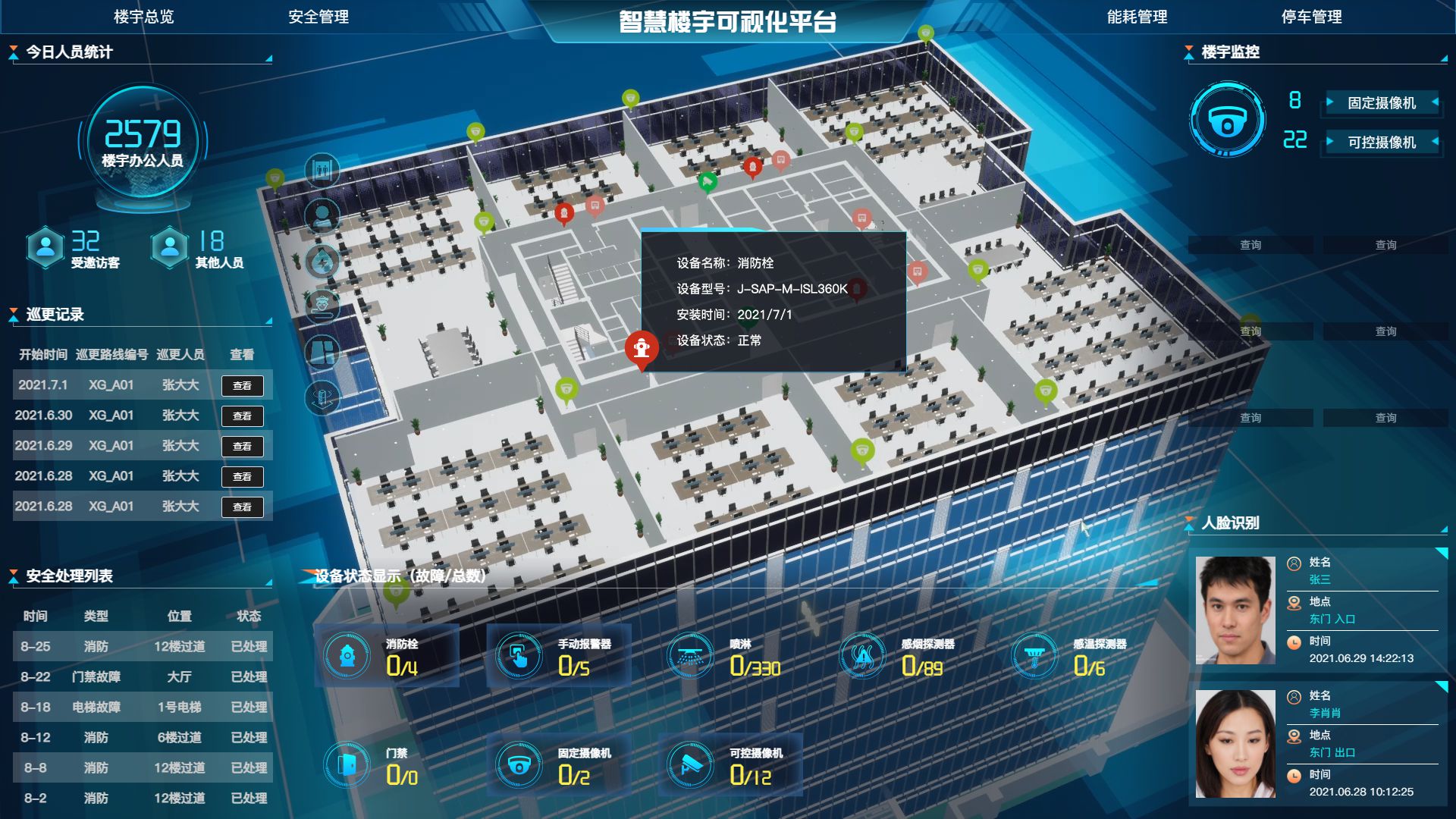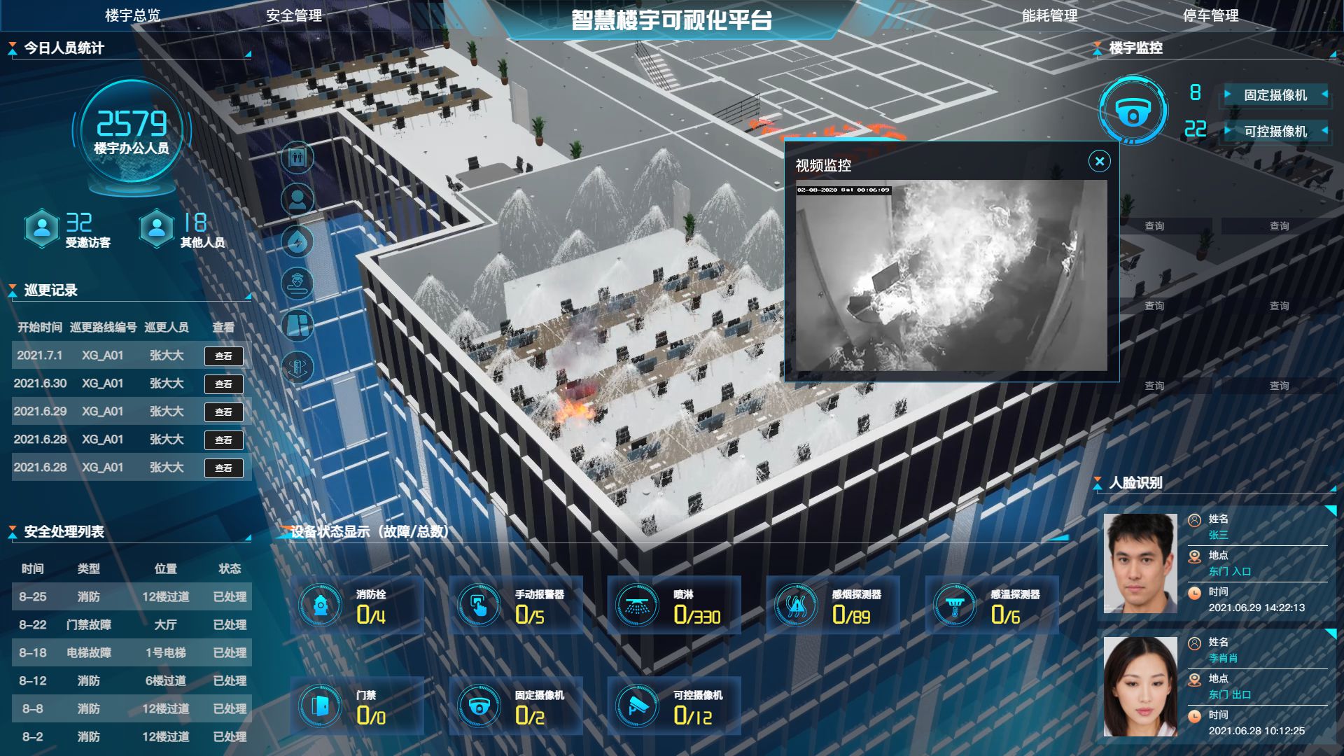 9、 消防管理:可视化的预案规划和论证,科学直观、实时的消防设备监控,安全可靠、自动规划消防疏散路径,提高反应时间、多系统联动,确保安全;