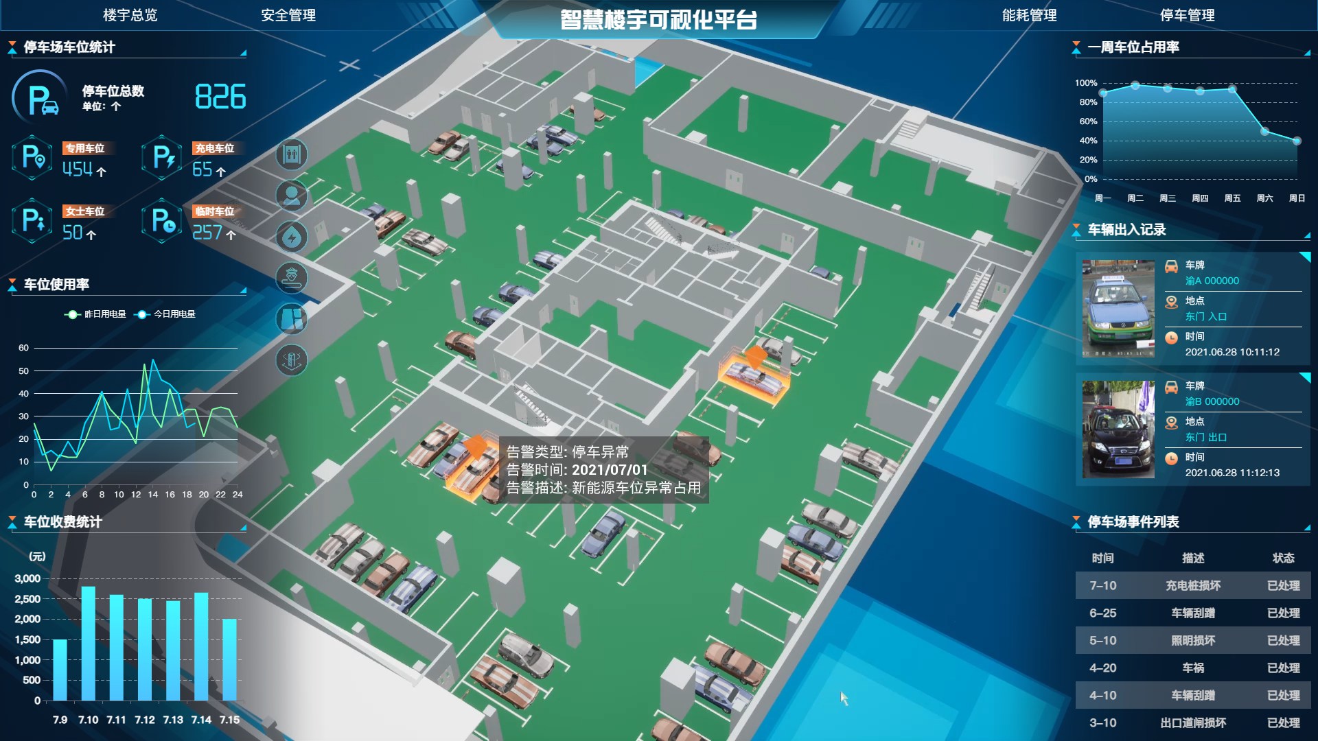 8、 停车管理:可视化的实施停车位状态及统计、丰富的车牌管理策略、可视化的反向寻车室内路径导航;